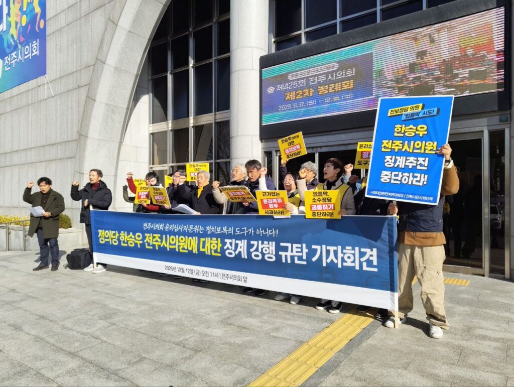 더불어민주당이 장악한 전주시의회는 한승우 의원이 어떤 윤리 기준을 위반했는지 구체적인 사실관계 하나 공개하지 못하면서 징계를 강행하려 한다. 뒤에서 돌아다니는 이야기로는 더불어민주당 의원들 사이에 한승우 의원이 복지환경위원회에서 활동한 것이 이해충돌이라는 어처구니없는 주장이 오갔다고 한다. 특히 이기동 전 의장은 한승우 의원의 복지환경위 배정을 막기 위해 의회 관계자를 통해 압박한 사실을 스스로 밝힌 바 있다. 하지만 이기동 전 의장 및 더불어민주당 의원들의 주장에는 아무런 법적 근거가 없다. 법률이 정하지 않은 바에 의해 시민의 선출을 받은 의원의 의정활동을 제한하고 방해하는 것은 그 자체로 의원의 시민 대표성을 훼손하는 반의회적 폭거일 뿐이다. 징계가 거꾸로 됐다. 이기동 전 의장이 한승우 의원의 복지환경위 배정을 막기 위해 압력을 행사한 행위는 헌법과 법률 위반으로 명백한 징계 사유이며, 그에 동조한 더불어민주당 의원들 역시 징계를 받아야 할 것이다.